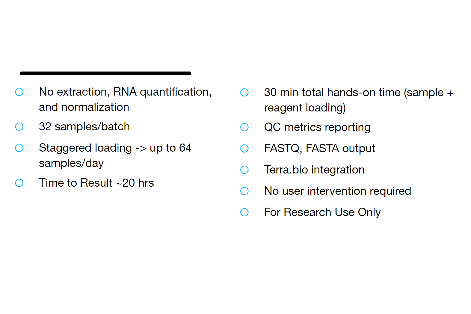 Our liquid handling includes cDNA synthesis, amplification of targets, indexing, nucleic acid clean-up, and initiating the sequencing run with no manual library preparation required.